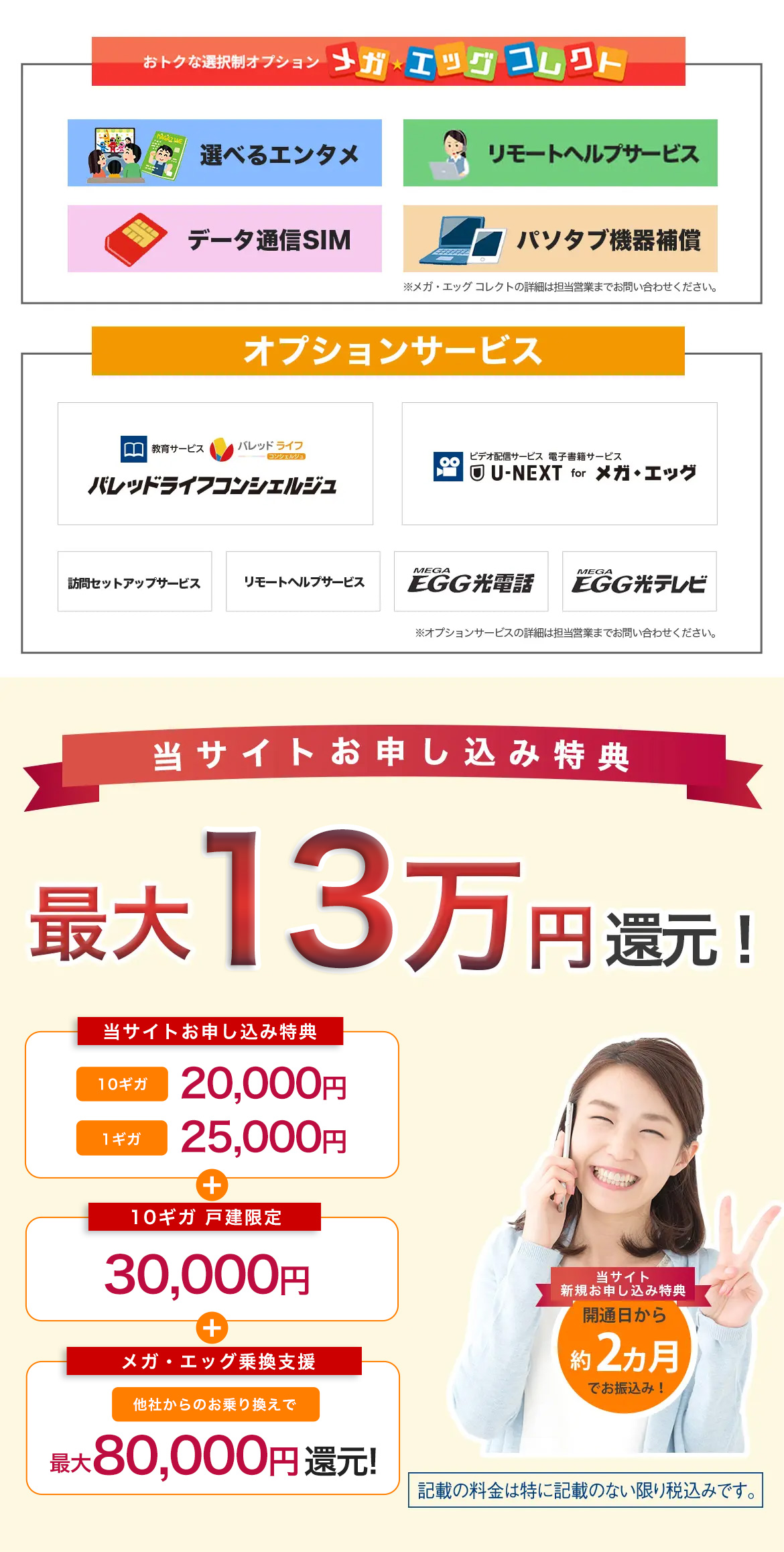※2 最大通信速度は、技術規格上の最大値であり、ベストエフォート型サービスのため、一定の通信速度を保証するものではありません。メガ・エッグ光ネット[マンション]VDSLタイプの1ギガサービスは、上りと下りの帯域を合わせた最大値となります。