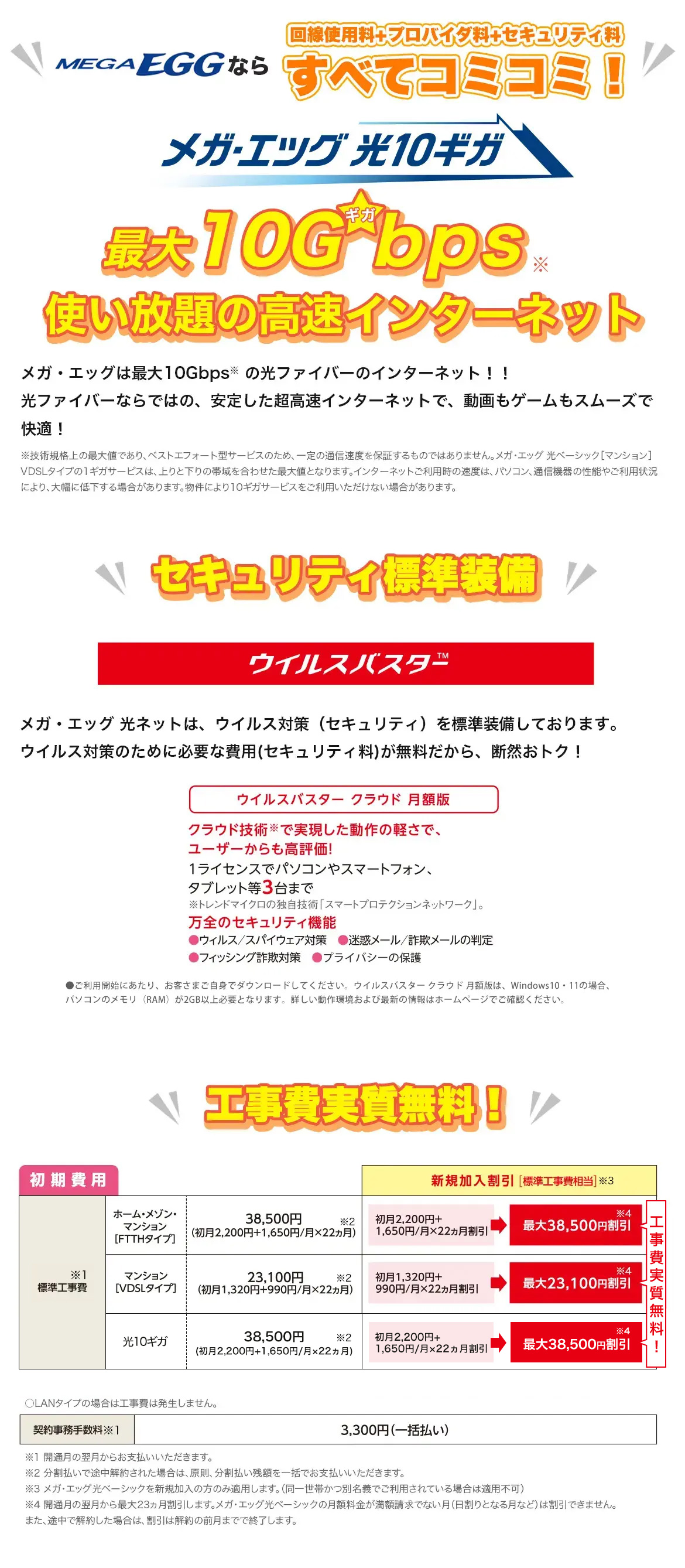 ※2 最大通信速度は、技術規格上の最大値であり、ベストエフォート型サービスのため、一定の通信速度を保証するものではありません。メガ・エッグ光ネット[マンション]VDSLタイプの1ギガサービスは、上りと下りの帯域を合わせた最大値となります。